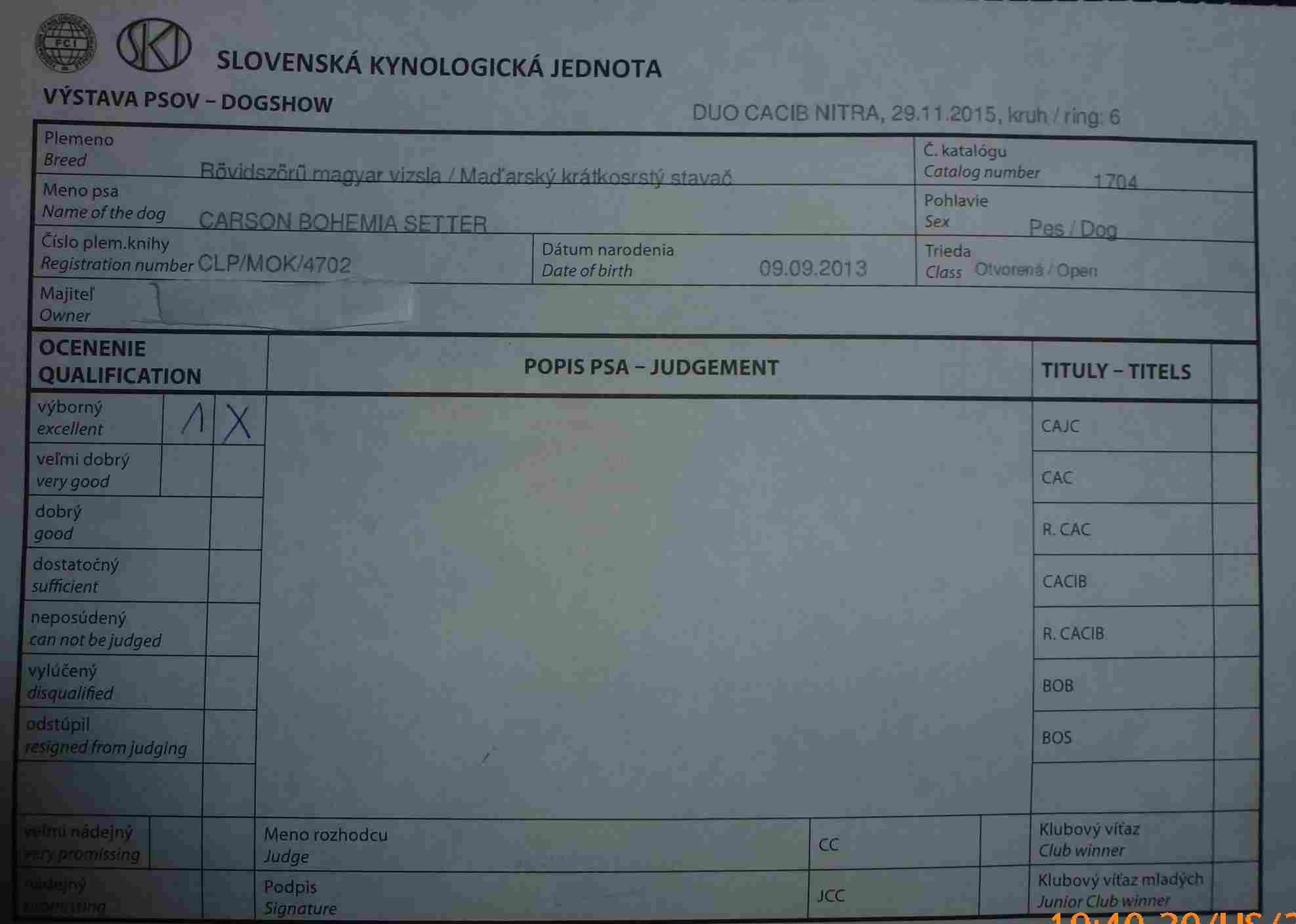 29.11.2015 jsme se vydali na dlouhou cestu na mezinárodní výstavu do Nitry. Panička dlouho rozmýšlela, jestli kvůli mé bídné výstavní kondici vůbec jet. Ale nemohli jsme nechat jet kamarádky a kamarády samotné. Na výstaviště jsme přijeli s předstihem a tak jsme se ještě měli čas u kruhu rozkoukat. Slovinské rozhodčí nebylo vůbec v angličtině rozumět, překladatelka nefungovala. My jsme do třídy otevřené nastoupili dva. Paní rozhodčí mě ohodnotila výborným 1, ale pochopili jsme, že na titul to není. Nic víc jsme se ale nedozvěděli ani z posudku . Chtělo to mít prostě nějaké to kilo navíc. Zkusili jsme teda změnit značku granulí a už je ze mě zase statný chlapík.
